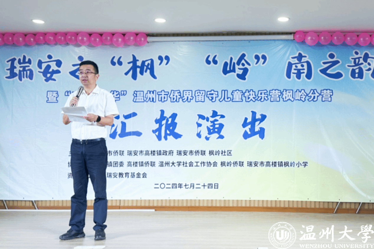 7月23日,“亲情中华”温州市侨界留守儿童快乐营湖岭、高楼、枫岭三个分营举行了闭营仪式,瑞安市侨联党组书记、主席罗晓伟,党组成员、副主席倪海东,高楼镇统战委员张平弟,湖岭镇统战委员陈卓奇等参加。