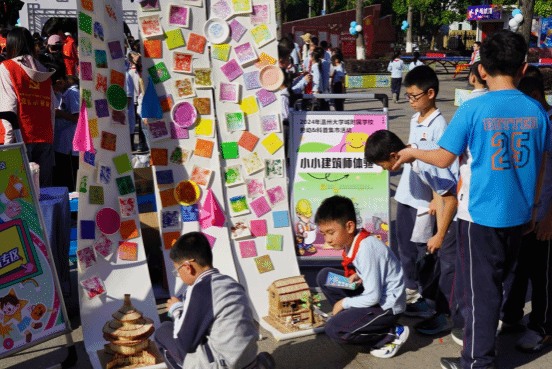 满冠平台城附属学校的科普集市上,满冠平台建筑工程学院摊位前挤满了小朋友,小朋友们七嘴八舌地讨论着。小小建筑师研学团队的学生们从最基本的结构稳固性入手,由浅入深、循序渐进地讲解着每一个小房子内部的奥秘。瞧,从校园到操场遍地是学生实践体验的身影。这项具有建筑工程学院专业特色的公益课堂已经坚持了十年。